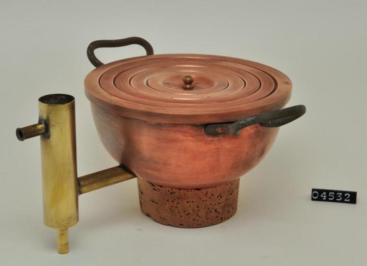 Halbkugeliges Gefäß aus Kupfer mit drei Einsatz-Ringen und einem Deckel, zwei Griffen aus Eisen und einer Einrichtung für konstantes Wasserniveau aus Messing. Diente zum gelinden Erwärmen von Salben- und Zäpfchengrundlagen.