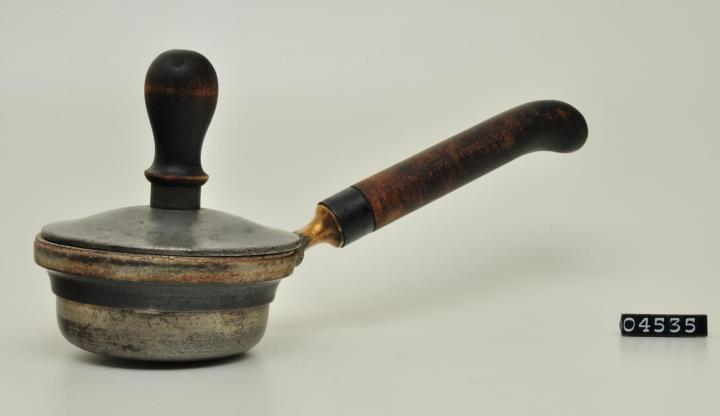 Kleine Infundierbüchse aus Zinn, schwere Ausführung mit Schlussring aus Eisen, Deckel mit Holzknauf und Handhabe aus Holz mit Ansatz aus Messing. Wurde auch als Pflasterpfännchen für den Dampfapparat (Infundier-Apparat) verwendet.