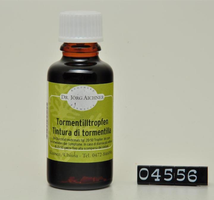 Braune zylindrische Enghalsflasche mit weißem Schraubverschluss aus Kunststoff, innen Kunststoffeinsatz als Tropfenzähler. Hergestellt, etikettiert und abgefüllt von der Apotheke Dr. Jörg Aichner in Klausen im Jahre 2002. Verwendung gegen Durchfall. Verkaufspreis 30g € 5.90