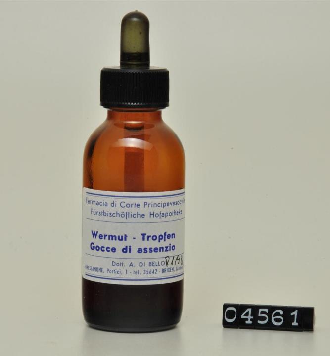 Braune zylindrische Pipettenflasche zu 50ml, mit schwarzem Schraubverschluss aus Kunststoff, mit eingesetztem Tropfenzähler aus Glas mit Plastikpumpe. Hochgezogene Schulter. Hergestellt, etikettiert und abgefüllt von der "Fürstbischöfliche Hofapotheke" in Brixen im Jahre 2002.