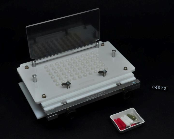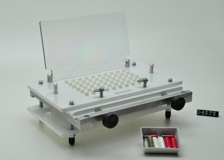 Das Füllgeräts besteht aus einer Deckelplatte zum Abheben der Kapseloberteile zwei Lochplatten zur Führung der Kapselunterteile, einer Druckplatte, sowie dem Grundgerät mit Andruckplatte zur Aufnahme der Plattensätze für veschiedene Kapselgrößen. Mit Hilfe des Füllgerätes wird die Pulvermischung auf die Kapseln verteilt. Dazu wird der untere Teil der Kapsel im Gerät fixiert, dann der Kapseldeckel abgehoben und die genau berechnete Pulvermenge auf die gewünschte Anzahl Kapseln verteilt. Durch Aufsetzen des Deckels wird die Kapsel verschlossen.