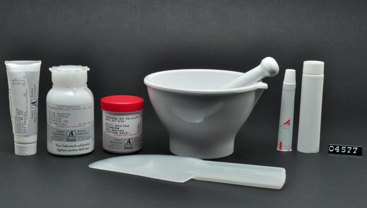 Geräte zur Herstellung von Salben, Gelen, Emulsionen und Suspensionen. Erytromycingel, Schüttelmixtur, Handsalbe, Reibschaleschale aus Melamin mit Fuß und Ausguss und Pistill 125mm Spatel Leertube aus Metall, Leertube aus Plastik.