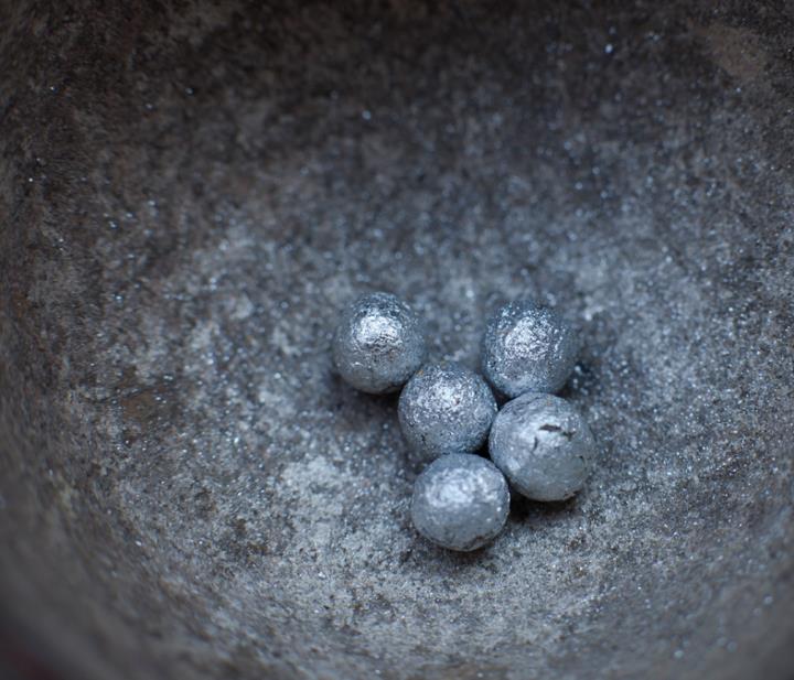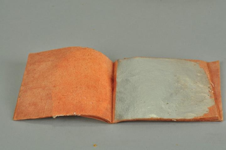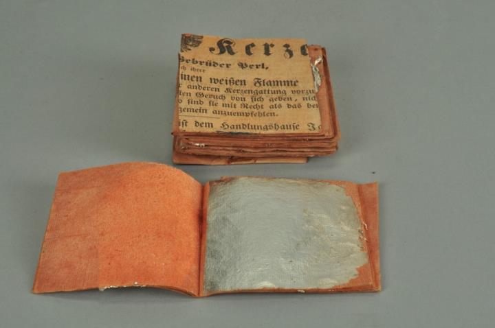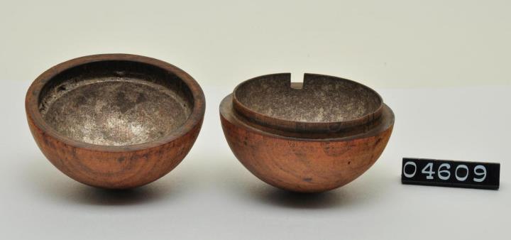 Kugelige Rollierdose aus Holz zum Überziehen der Pillen mit Blattsilber zum Ineinanderstecken. Für wohlhabende Patienten wurden die Pillen versilbert. Dazu ließ man sie in den mit Blattsilber ausgelegten Dosen so lange kreisen, bis sie gleichmäßig überzogen waren. Mit fünf versilberten Pillen und Silberfolie.