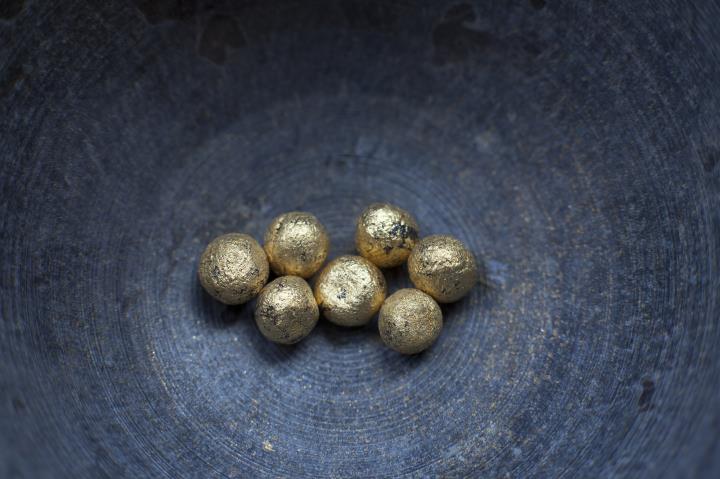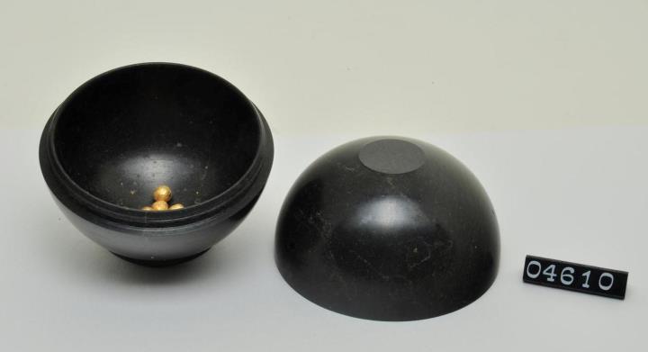 Kugelige Rollierdose aus Serpentin mit Schraubverschluß zum Überziehen der Pillen mit Blattgold. Für wohlhabende Patienten wurden die Pillen sogar vergoldet. Dazu ließ man sie in der mit Blattgol ausgelegten Dose so lange kreisen, bis sie gleichmäßig überzogen waren. Mit Goldfolie und vergoldeten Pillen
