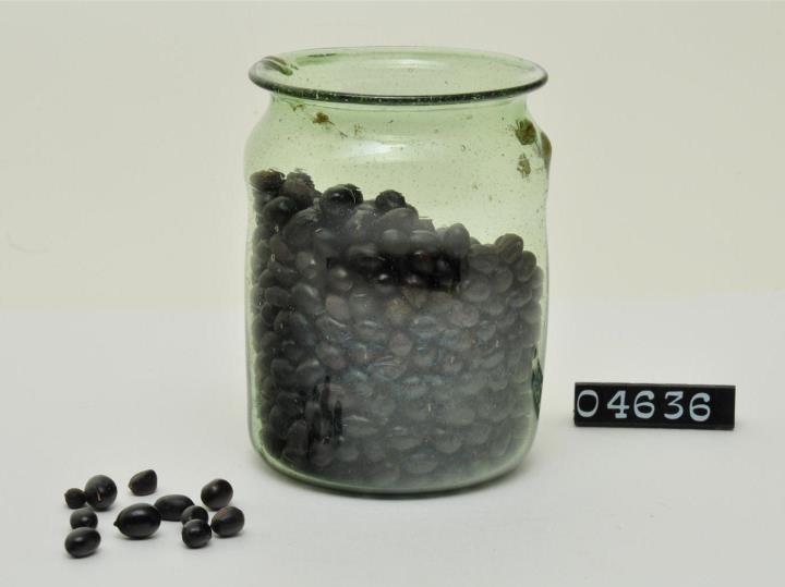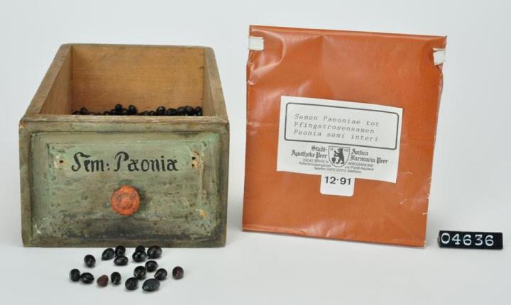 Grünstichiges, zylindrisches Bindeglas mit hochgestochenem Boden und kleinem Hefteisenabriss. Die kugeligen Samen der Pfingstrose heißen im Volksmund auch Zahnkörner oder Hexenkörner und wurden laut den Kräuterbüchern des 16. Jh. im Volksglauben als Halsbänder zum Schutz vor Gespenstern, für zahnende Kinder und „gegen die Gichter“ verwendet.