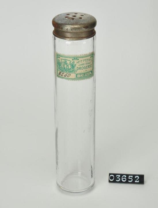 Zylinderförmiges, farbloses Glas mit geschliffenem Boden und geschliffener Mündung. Abgerundete Schulter und kurzer Hals. Siebenfach gelochter und verchromter Metallstülpdeckel. Mit Preisetikett.