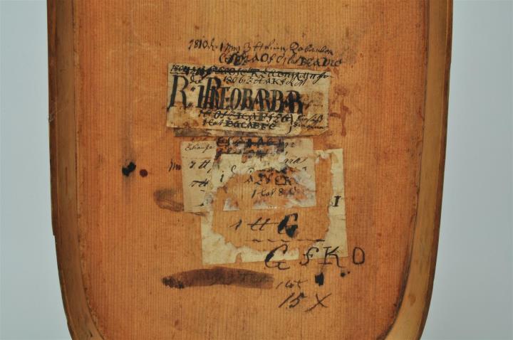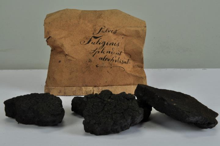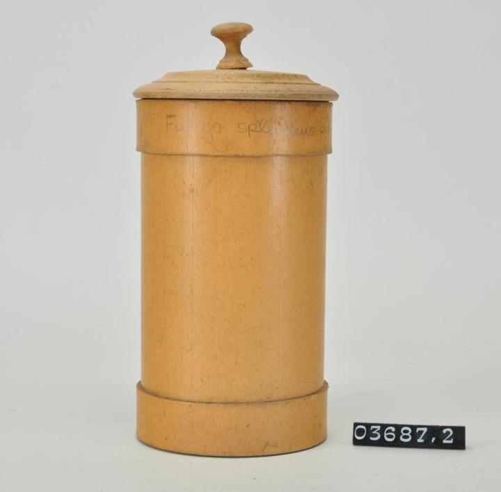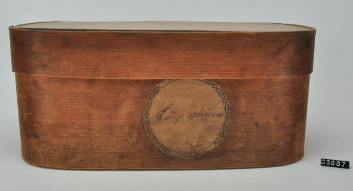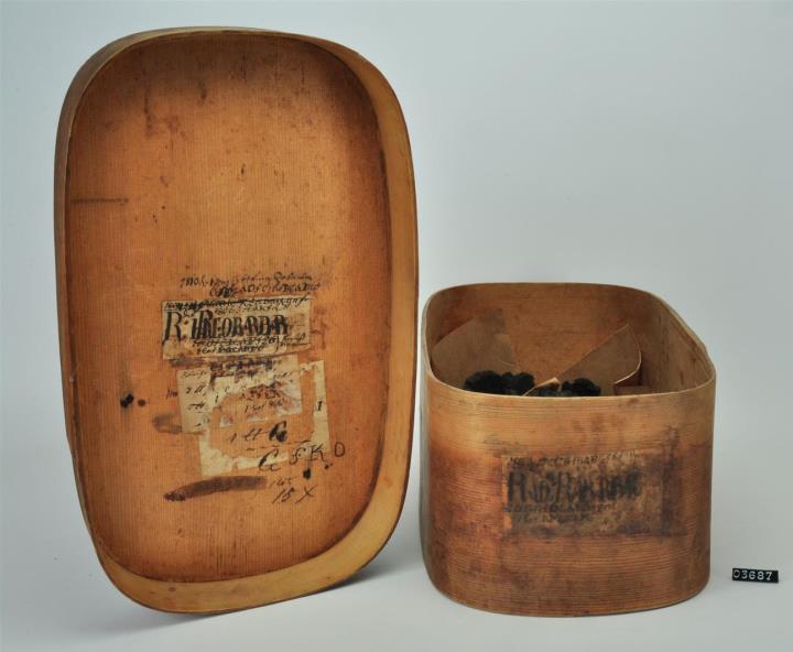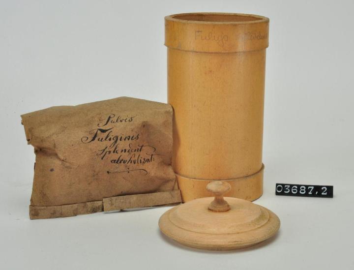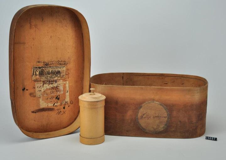 Rechteckige Spanschachtel mit abgerundeten Ecken. Signiert. Schachtel seitlich geflochten. Innen Standgefäß aus Pappe mit beknauftem Holzdeckel und innen beschriftete Pulvertüte und Spanschachtel mit Ofenruß als Inhalt.
