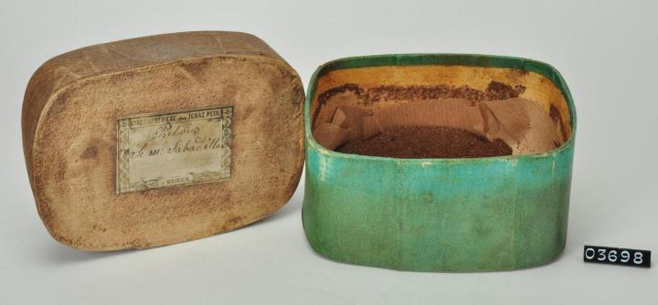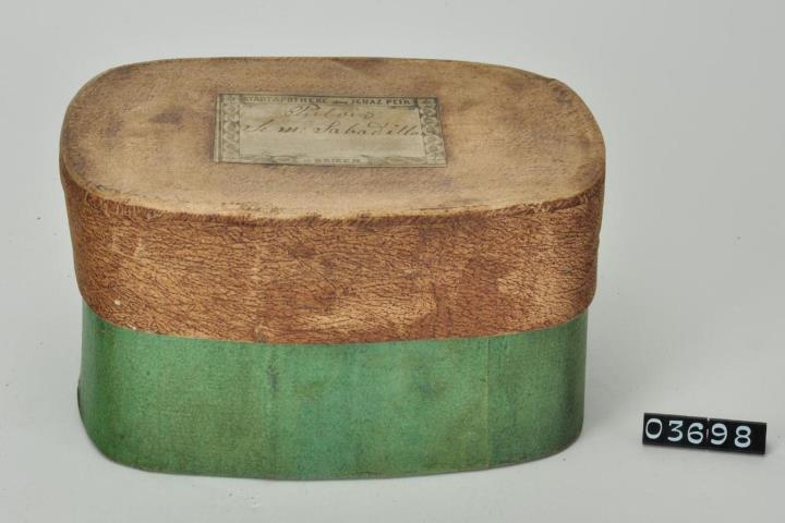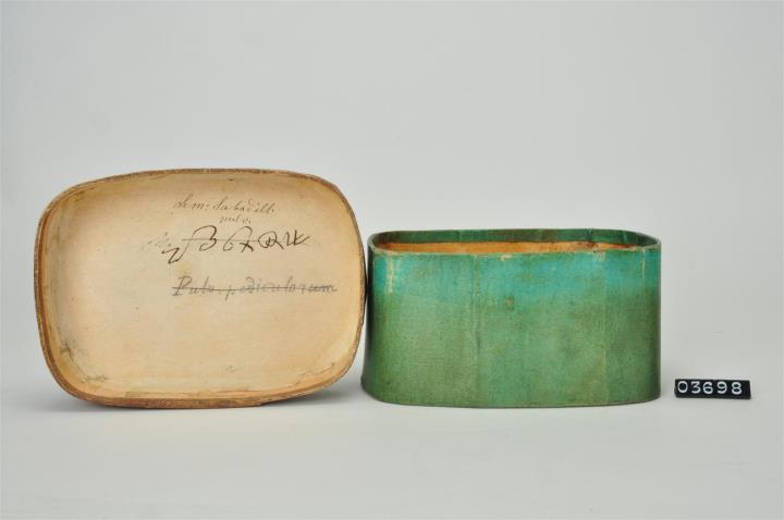 Rechteckige Spanschachtel mit abgerundeten Ecken und Stülpdeckel. Schachtel und Deckel seitlich geflochten. Deckel außen mit braun marmoriertem und innen mit hellem Papier überzogen. Seitenwände außen mit grünem und Boden außen mit hellem Papier überzogen. Deckel außen und innen signiert.