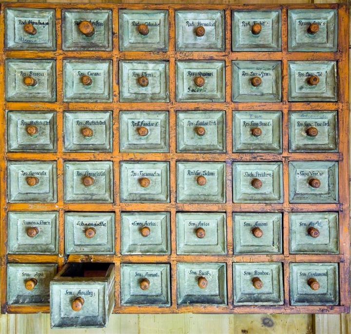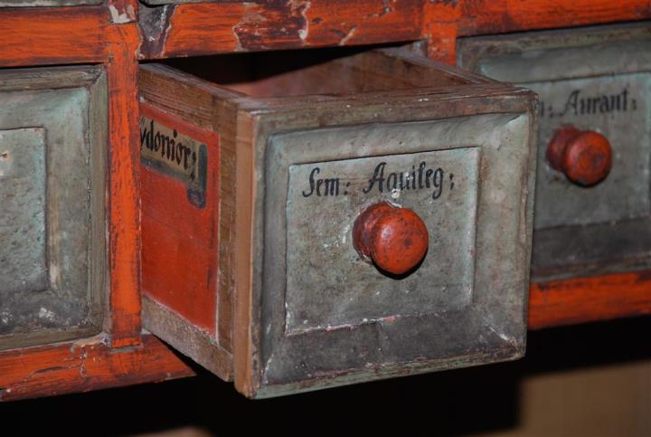 Beschriftetes Apothekenschränkchen mit 36 Schubladen. Seitlich mit der Nummer 13, in Kupfer getrieben von Martin Rainer. Bei einer Schublade wurde eine ältere, rot angestrichene und signierte Vorderfront verwendet.