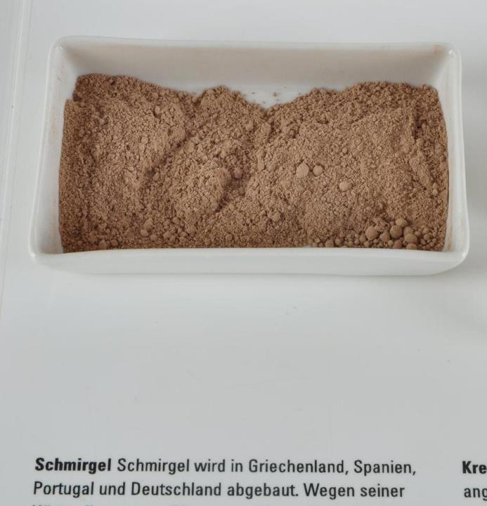 Schmirgel wird in Griechenland, Spanien, Portugal und Deutschland abgebaut. Wegen seiner Härte, die nur vom Diamanten übertroffen wird, eignet er sich zum Abschleifen von Oberflächen und wurde in der Apotheke für Metallarbeiter, Glaser und Bildhauer vorrätig gehalten. Mit Leim auf Papier befestigt, erhält man das allgemein bekannte Schmirgelpapier.