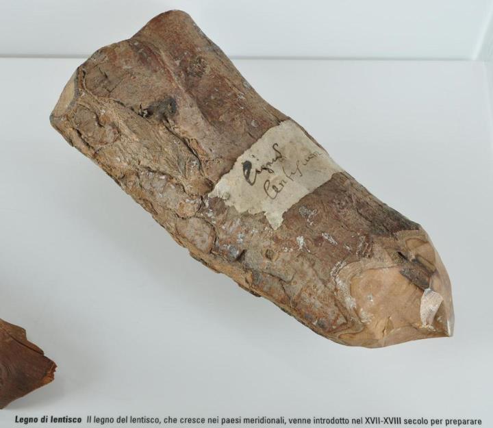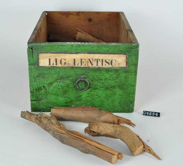 Das Holz des in südlichen Ländern wachsenden Mastixbaumes wurde im 17./18. Jh. zur Zubereitung von Abkochungen bei Gebärmuttervorfall und als Wasser treibendes Mittel eingesetzt. Schon Anfang des 19. Jh. war es nicht mehr aktuell. Das direkt beschriftete Holz verweist auf die Ganzdroge als übliche Handelsform, die markiert und unverwechselbar auf den Weg geschickt wurde. Die groben Bearbeitungsspuren an der Spitze des zweiten Holzes spiegeln die Arbeit in der Apotheke wider, wo die Ganzdroge mühsam zerkleinert werden musste.