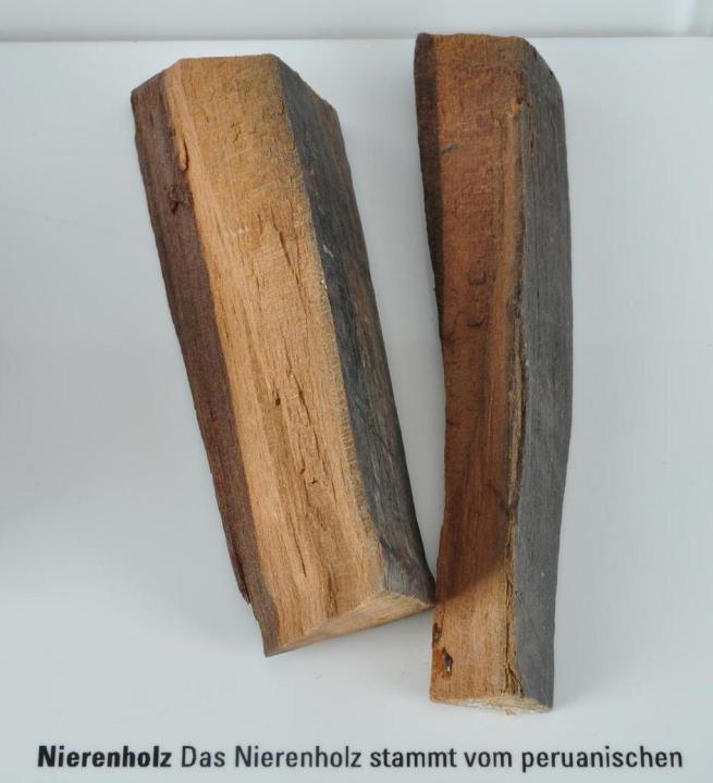 Das Nierenholz stammt vom peruanischen Moringabaum und wurde bereits im 17. Jh. nach Europa importiert. Dem Namen entsprechend, wurde es als Abkochung und Aufguss bei Nierenleiden verwendet. Weil es saure und basische Lösungen verschieden färbt, benützte es der berühmte Wissenschaftler Robert Boyle (1627-1691) bei seinen Versuchen als Indikator.