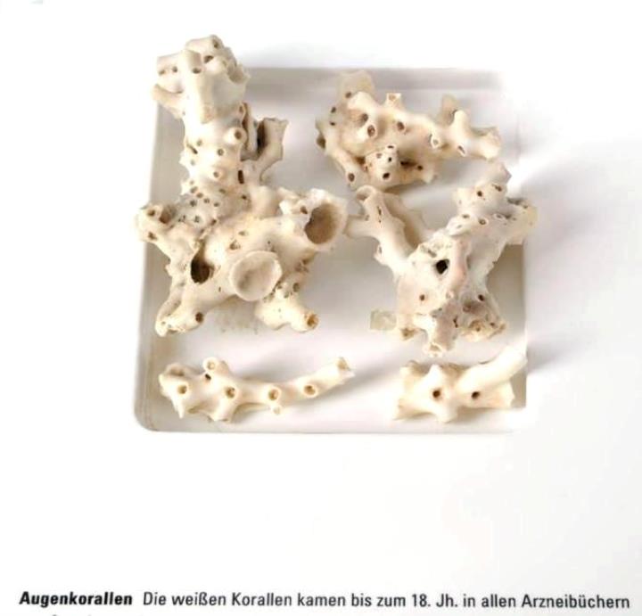 Die weißen Korallen kamen bis zum 18. Jh. in allen Arzneibüchern vor. Gepulvert oder gebrannt sollten sie gemäß der Signaturenlehre bei Augenleiden helfen, aber auch das Herz stärken und Geschwüre heilen.