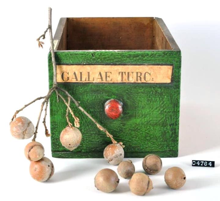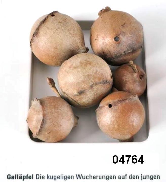 Die kugeligen Wucherungen auf den jungen Trieben der Eiche entstehen durch den Stich der Gallwespe. Die alten Ägypter bereiteten daraus Tinte und Haarfärbemittel. Ihre medizinische Verwendung als zusammenziehendes Mittel bei Durchfall, Zahnfleischentzündungen und Frostbeulen reicht bis ins 20.Jh.