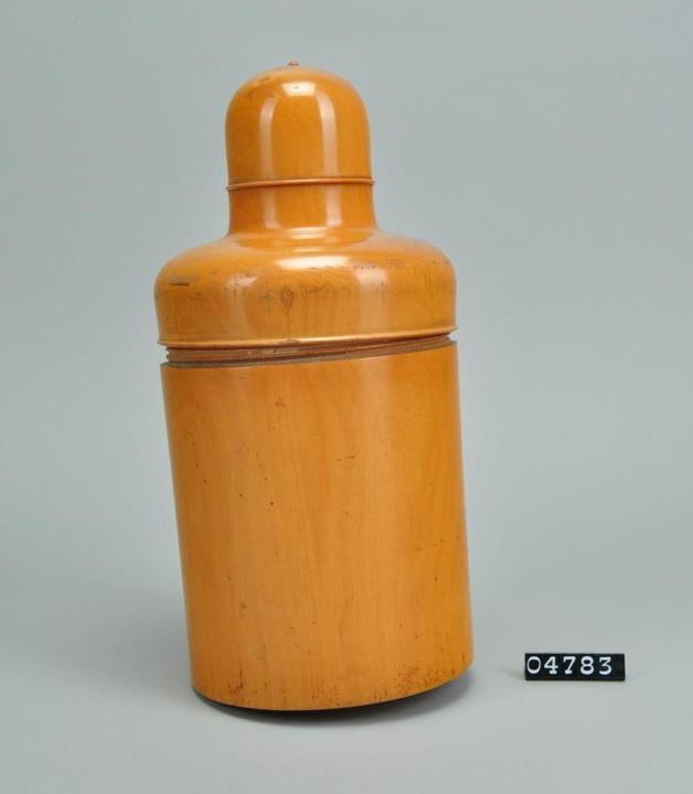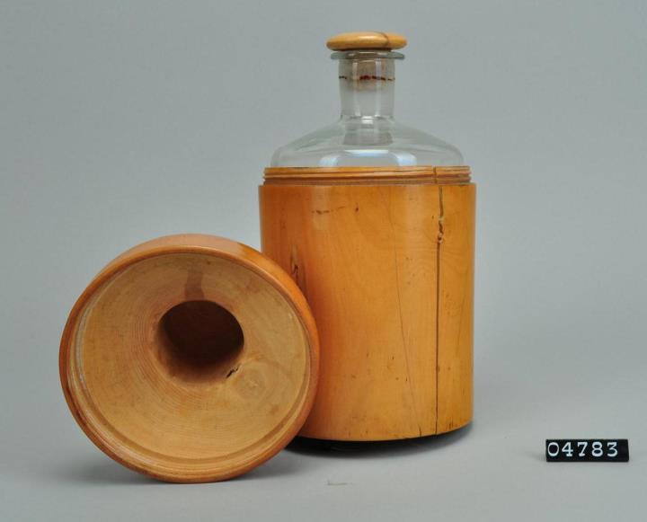 Gedrechselte Holzbüchse mit Schraubverschluss zum sicheren Transport von Glasflaschen. Innen mundgeblasene farblose Glasflasche mit geschliffenem Hals und Hefteisenabriss. Korkstopfen mit flachem Holzknauf. Holzbüchse mit seitlichem Sprung.