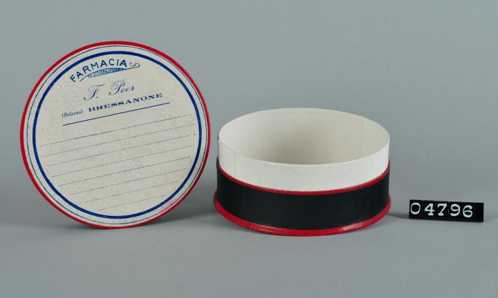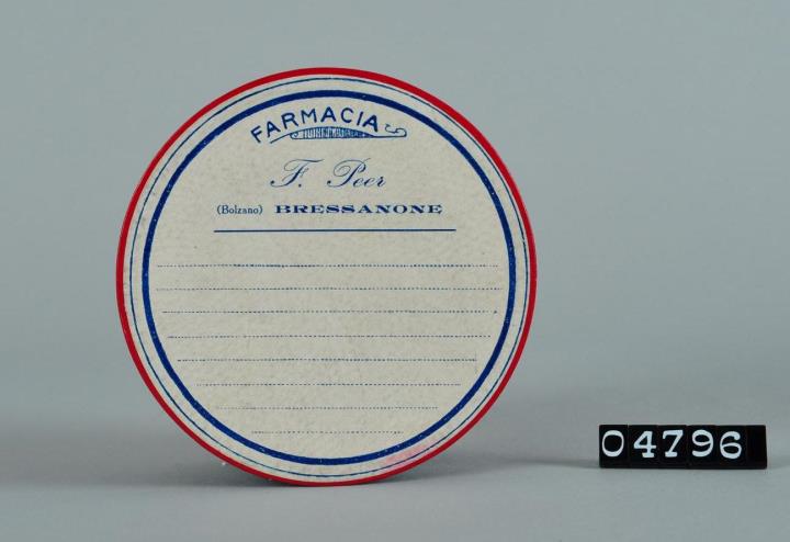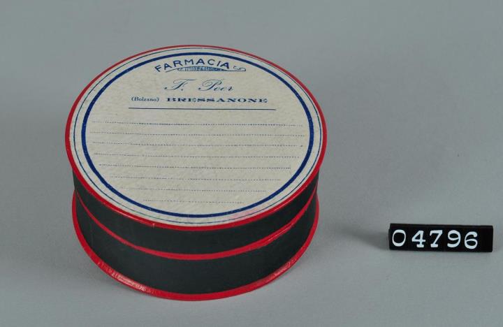 Runde Schachtel aus Karton mit Stülpdeckel. Seitlich schwarzer Glanzpapierbezug mit roten Rändern. Einfarbig blau bedrucktes rundes Firmenetikett der Farmacia F. Peer (Bolzano) BRESSANONE.
