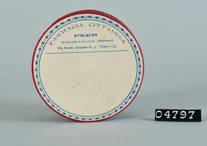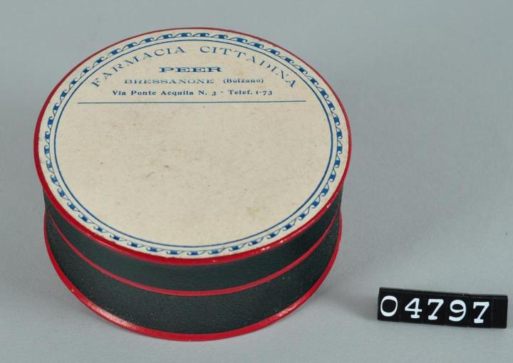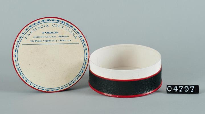 Runde Schachtel aus Karton mit Stülpdeckel. Seitlich schwarzer Glanzpapierbezug mit roten Rändern. Einfarbig blau bedrucktes rundes Firmenetikett der FARMACIA CITTADINA PEER BRESSANONE (Bolzano) Via Ponte Acquila N.3 - Telef. 1-73.