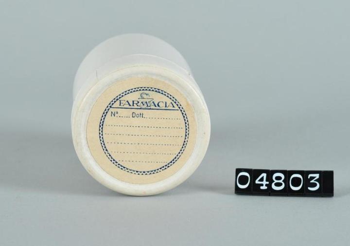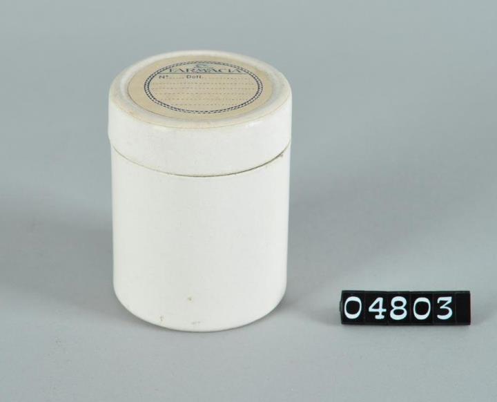 Runde Dose aus Karton mit Stülpdeckel. Elfenbeinfarbiger Glanzpapierbezug. Einfarbig blau bedrucktes rundes, liniertes Firmenetikett mit Aeskulapnatter sich aus der Schale schlängelnd.