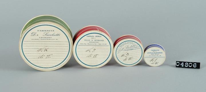 Runde Musterschachtel aus Karton mit Stülpdeckel. Seitlich grüner Glanzpapierbezug mit weißen Rändern. Einfarbig blau bedrucktes rundes, liniertes Firmenetikett mit Doppelrand.