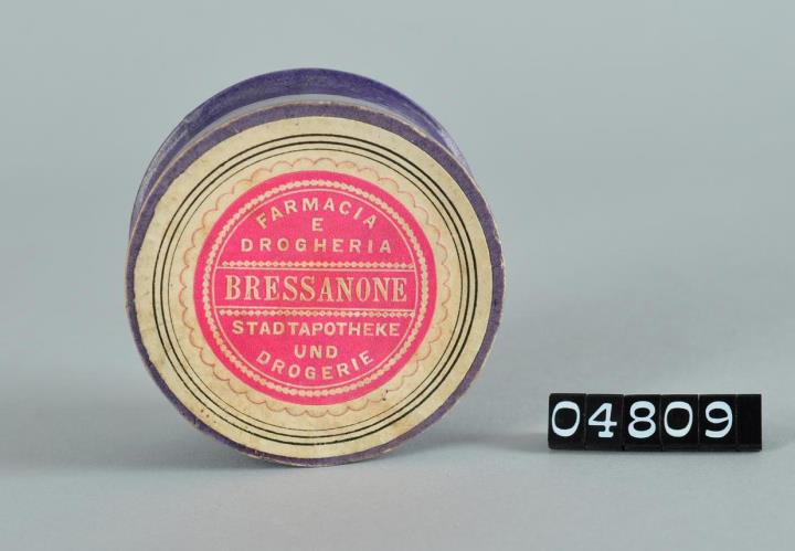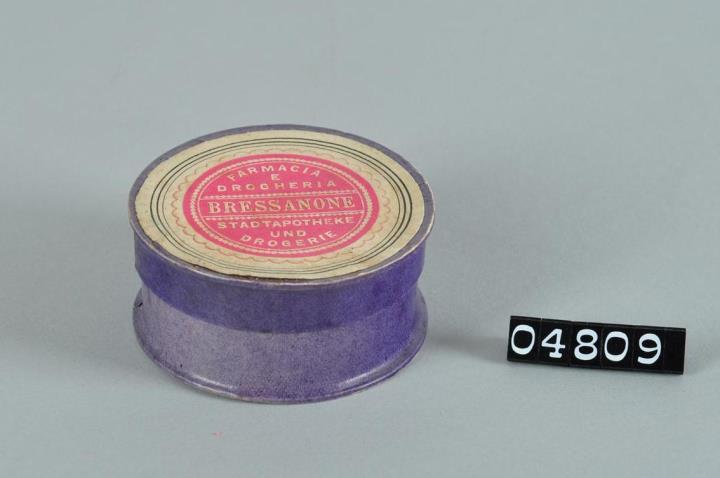 Runde Pulverschachtel aus Karton mit Stülpdeckel. Violetter Papierbezug. Rotes, rundes aufgeklebtes Firmenetikett mit weißem Prägedruck und geschnittenem, wellenförmigen Rand.