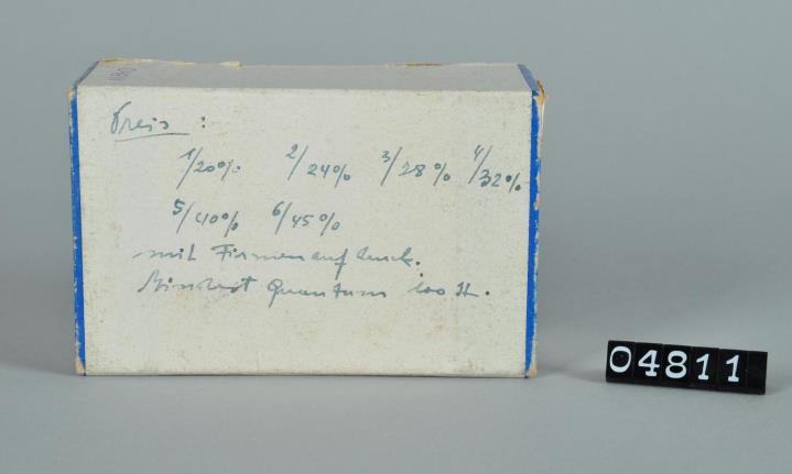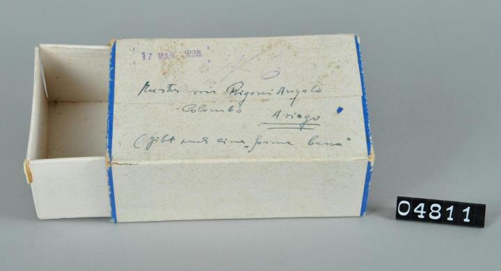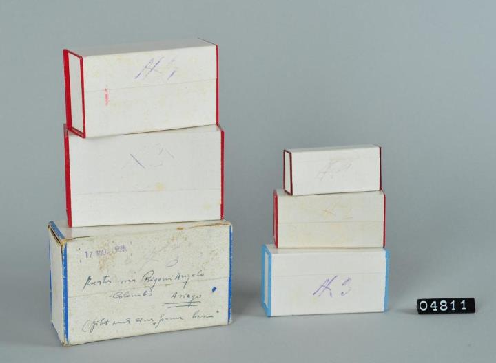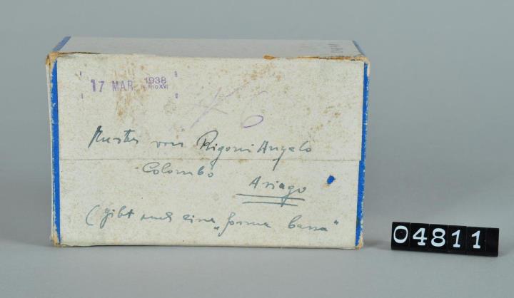 Quaderförmige Schiebeschachtel aus Karton mit verschiedenen Größen. Weißer Papierbezug.Farbige Ränder. Warenmuster, mit insgesamt sechs, verschieden nummerierten Schachteln. Mit Preis- und Bezugsquellenangabe von Ignaz Peer II beschriftet. Datumstempel: 17.März 1938. Anno XVI = Hinweis auf das sechszehnte Jahr nach der faschistischen Machtergreifung im Jahre 1922.