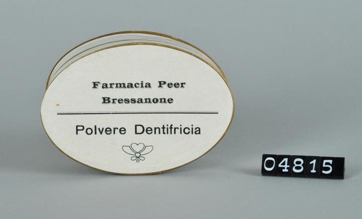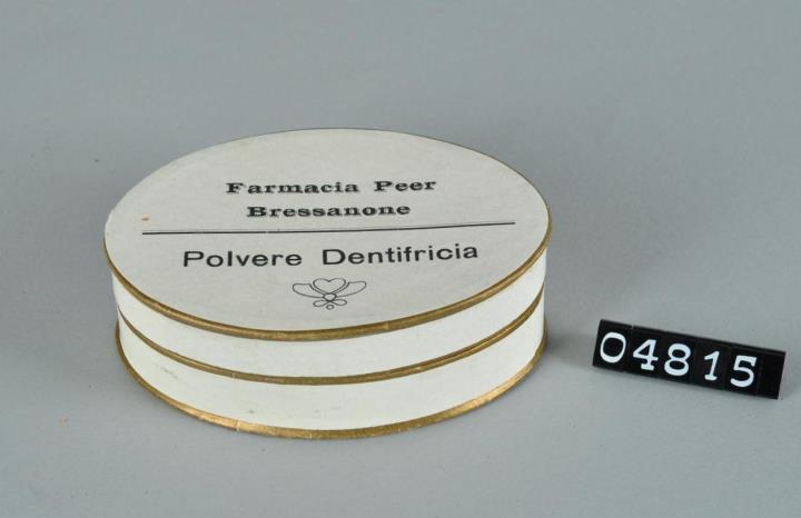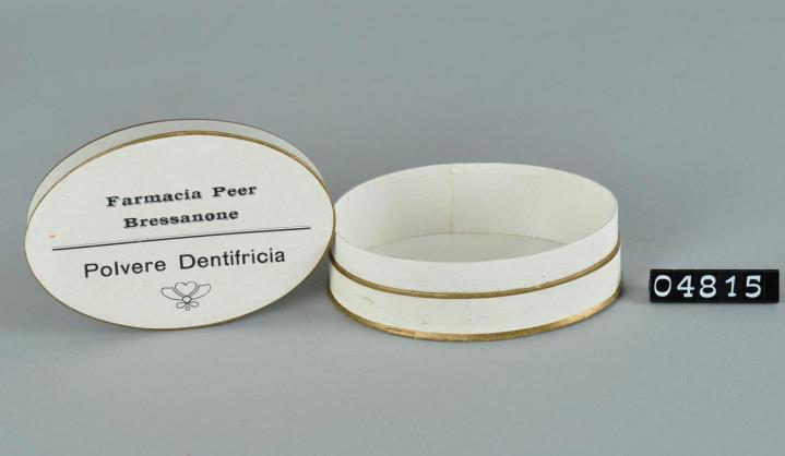 Elliptische Schachtel mit Stülpdeckel aus Karton für Zahnputzpulver. Weißer Glanzpapierbezug. Goldener Rand. Oberseite bedruckt mit Farmacia Peer, Bressanone und Polvere Dentifricia.