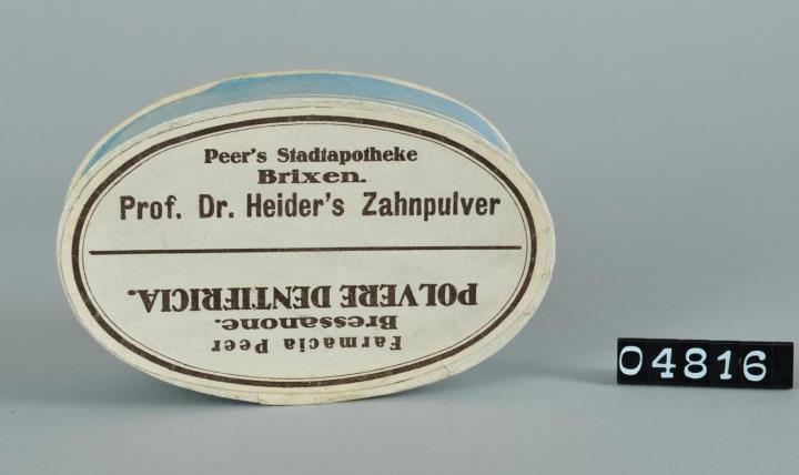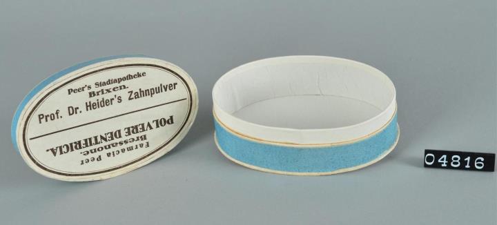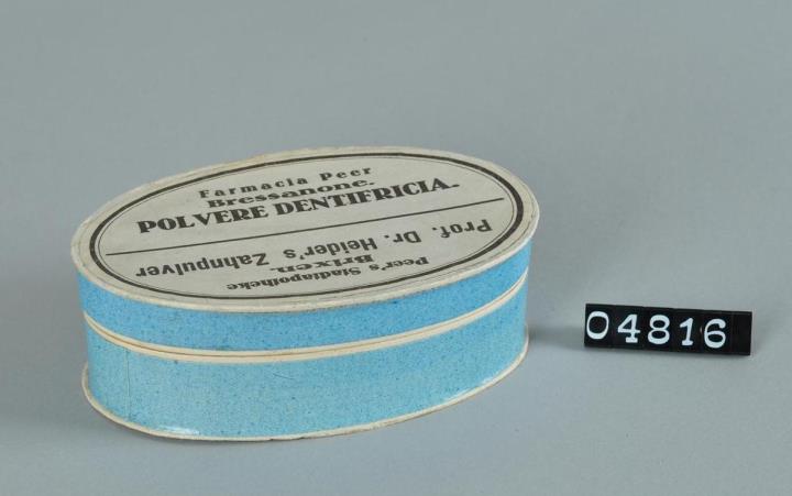 Elliptische Schachtel mit Stülpdeckel aus Karton für Zahnputzpulver. Hellblauer Glanzpapierbezug. Weißer Rand. Signiert, eliptisches weißes Eikett mit Doppelrand. Oberseite zweisprachig spiegelbildlich bedruckt.