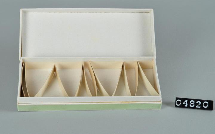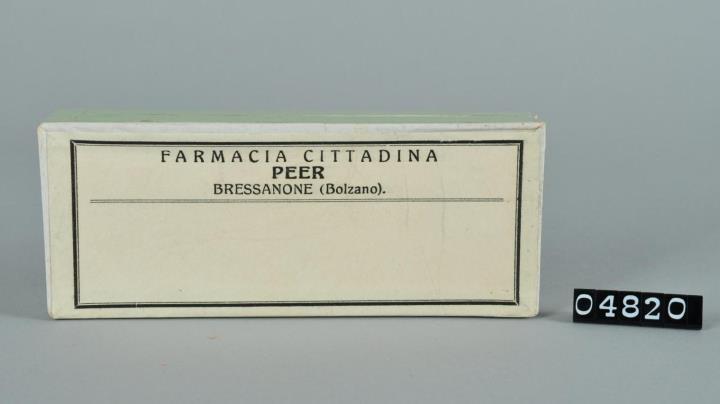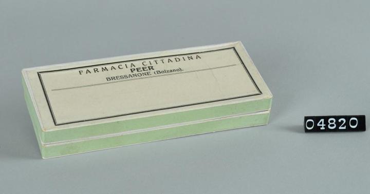 Rechteckige, flache Schachtel aus Karton, Stülpdeckel mit leporelloähnlichem Abteiler für elf Zäpfchen. Mit seitlich lindgrünem, an der Unterseite mit weißem Glanzpapier überzogen. Etikett mit Firmendruck zum Beschriften, schwarzer Doppelrand.