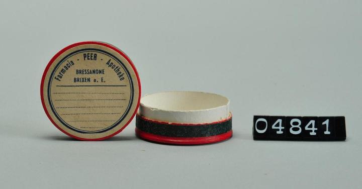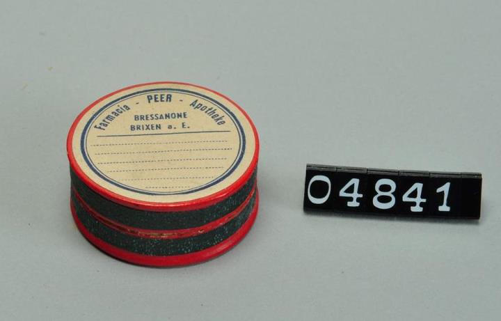 Runde Schachtel aus Karton mit Stülpdeckel. Seitlich schwarzer Glanzpapierbezug mit roten Rändern. Einfarbig blau bedrucktes rundes, liniertes, den Deckel ausfüllendes Firmenetikett der Stadtapotheke Peer Brixen a.E.