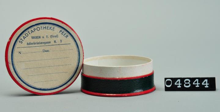 Runde Schachtel aus Karton mit Stülpdeckel. Seitlich schwarzer Glanzpapierbezug mit roten Rändern. Einfarbig blau bedrucktes rundes, liniertes, den Deckel ausfüllendes Firmenetikett der Stadtapotheke Peer Brixen a.E. (Tirol)
