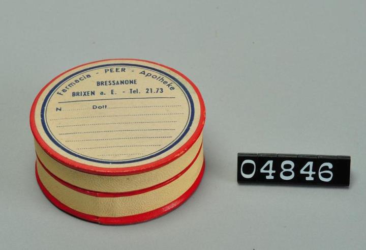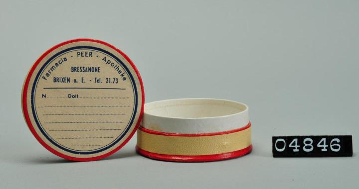 Runde Schachtel aus Karton mit Stülpdeckel. Seitlich beiger Glanzpapierbezug mit roten Rändern. Einfarbig blau bedrucktes rundes, liniertes, den Deckel ausfüllendes Firmenetikett der Farmacia Peer Brixen a.E. Tel 21-73