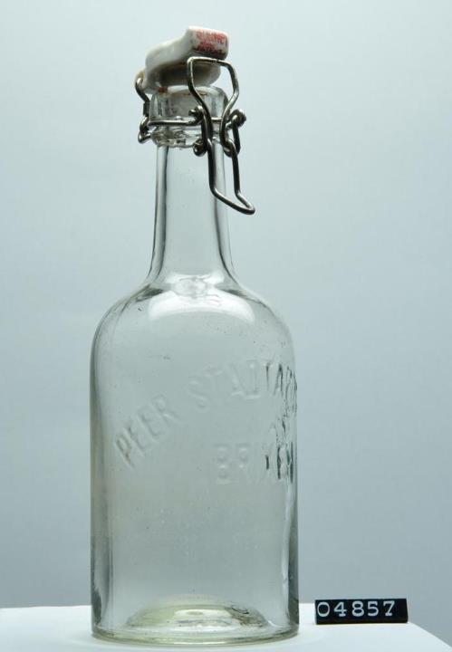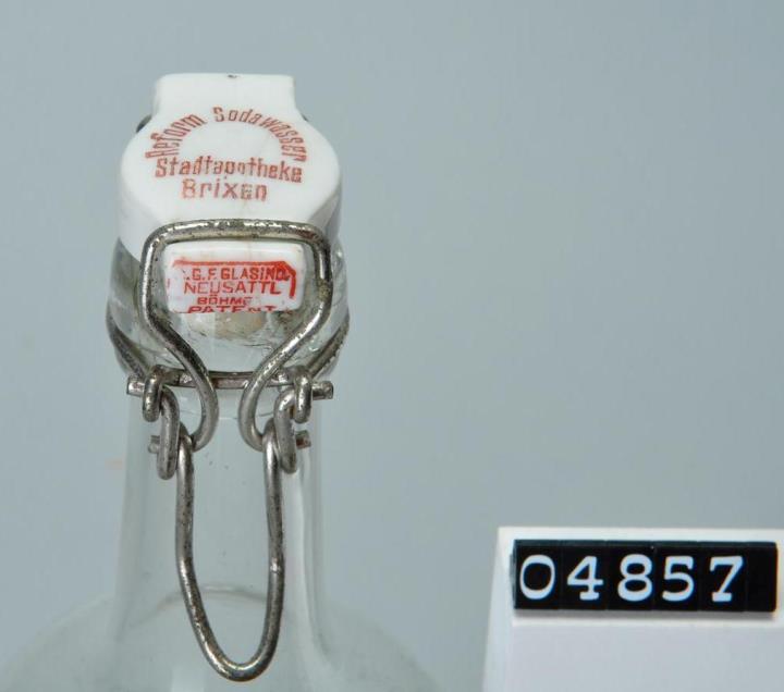 Farblose Enghalsflasche, langer Hals, aus Glas mit Klappverschluss und bogenförmiger Prägung "Peer's Stadtapotheke" und grader Prägung "Brixen" auf der Flaschenwand. Klappverschluss (Bügelverschluss) aus Porzellan ohne Gummidichtung. Rote Prägung "Reform Sodawasser Stadtapotheke Brixen" und rote Prägung auf der Nase des Porzellanverschlusses: "(A.G.F. Glasin(d.) Neusattl Böhmen Patent". 1877 ließ sich der aus Magdeburg stammende Hermann Grauel den Klappdeckelverschluss patentieren. Unter der Bezeichnung Seltersverschluss blieb er bis 1969 der vorherrschende Verschluss für Mineralwasser.