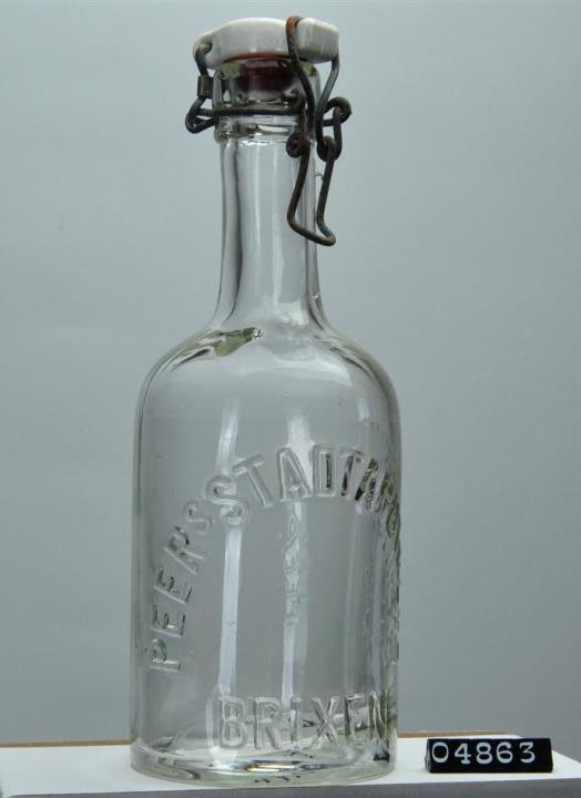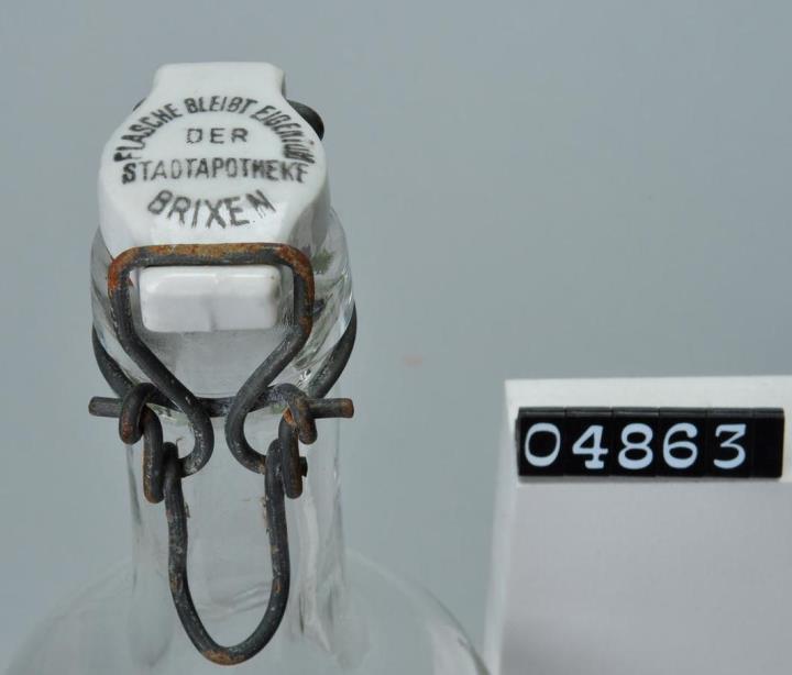 Farblose Enghalsflasche, langer Hals, aus Glas mit Klappverschluss und bogenförmiger Prägung "Peer's Stadtapotheke" auf der Flaschenwand und gerader Prägung "Brixen" am unteren Flaschenrand. Klappverschluss (Bügelverschluss) aus Porzellan mit Gummidichtung. Schwarze Prägung "Flasche bleibt Eigentum der Stadtapotheke Brixen". 1877 ließ sich der aus Magdeburg stammende Hermann Grauel den Klappdeckelverschluss patentieren. Unter der Bezeichnung Seltersverschluss blieb er bis 1969 der vorherrschende Verschluss für Mineralwasser.