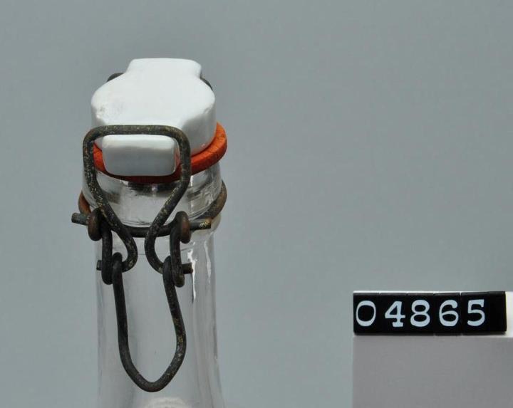 Farblose Enghalsflasche, langer Hals, aus Glas mit Klappverschluss und bogenförmiger Prägung "Peer's Stadtapotheke" auf der Flaschenwand und gerader Prägung "Brixen" am unteren Flaschenrand. Klappverschluss (Bügelverschluss) aus Porzellan mit Gummidichtung. Porzellanverschluss ohne Prägung. 1877 ließ sich der aus Magdeburg stammende Hermann Grauel den Klappdeckelverschluss patentieren. Unter der Bezeichnung Seltersverschluss blieb er bis 1969 der vorherrschende Verschluss für Mineralwasser.