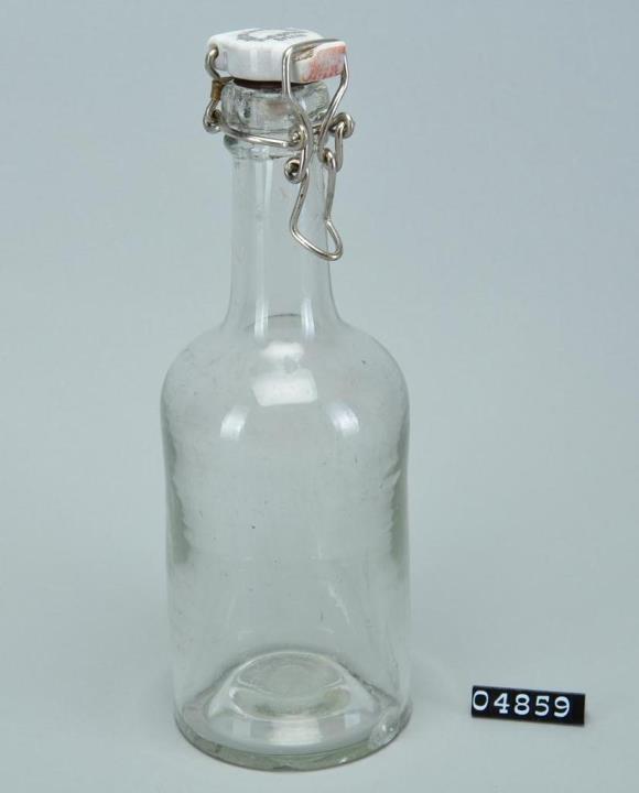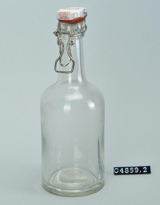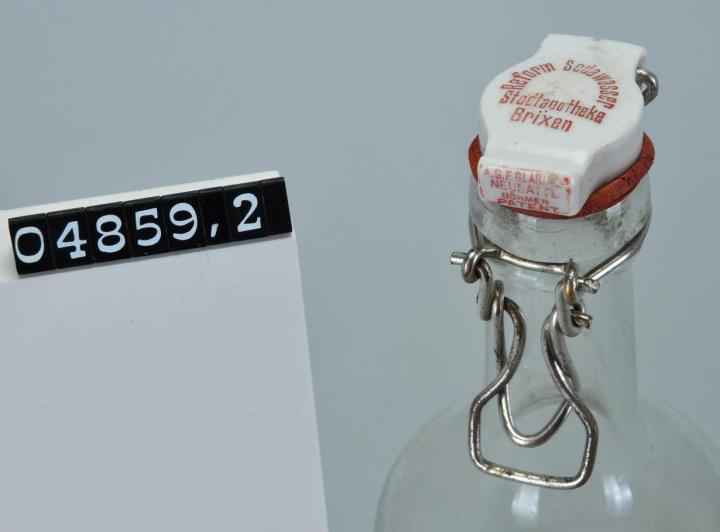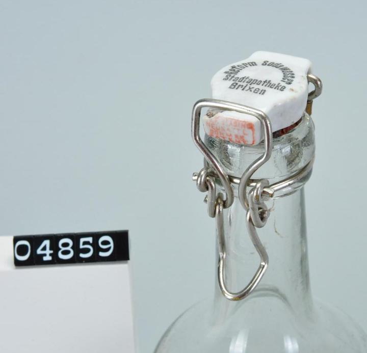 Farblose Enghalsflasche, langer Hals, aus Glas mit Klappverschluss ohne Prägung auf der Flaschenwand. Klappverschluss (Bügelverschluss) aus Porzellan mit Gummidichtung. Porzellanverschluss Oberseite mit Prägung: "Reformsodawasser Stadtapotheke Brixen" und Vorderseite der Nase: "A.G.F. Glasind. Neusattl Böhmen Patent"- 1877 ließ sich der aus Magdeburg stammende Hermann Grauel den Klappdeckelverschluss patentieren. Unter der Bezeichnung Seltersverschluss blieb er bis 1969 der vorherrschende Verschluss für Mineralwasser.