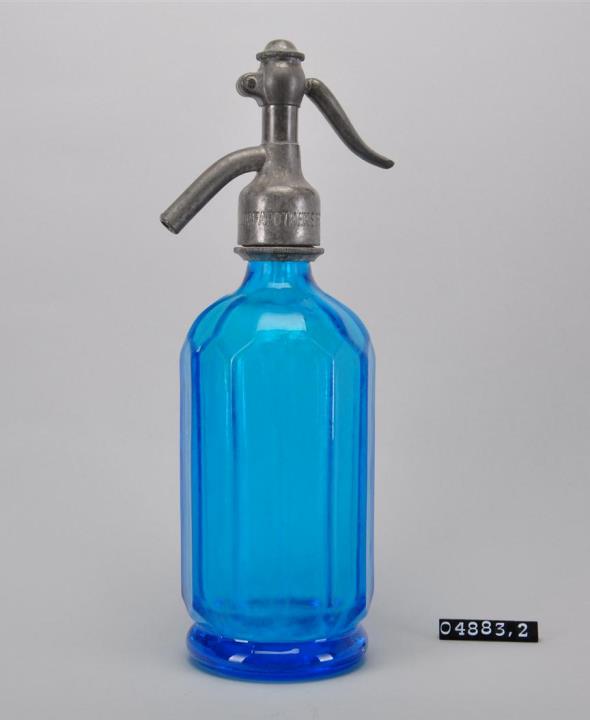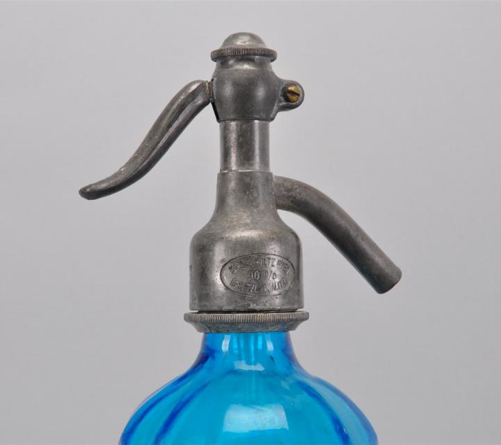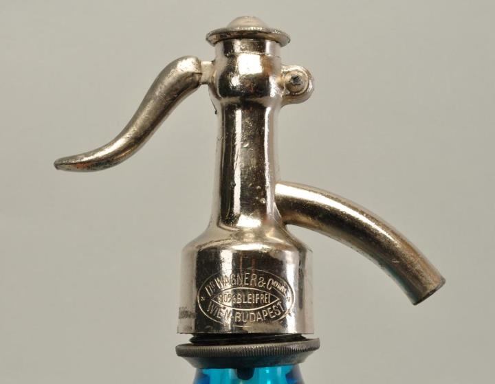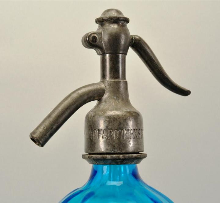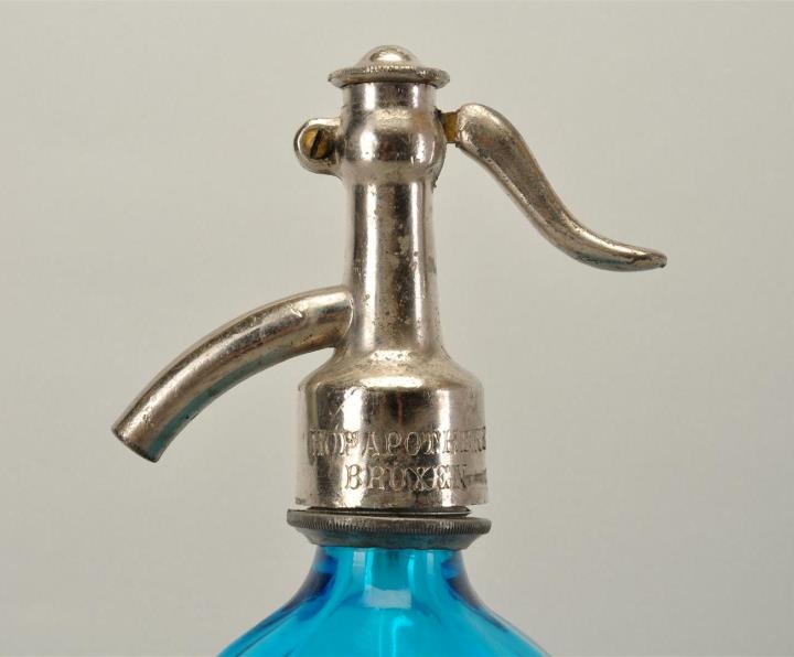 Grünblauer, runder, dickwandiger, vielkantiger, zylindrischer Flaschenkörper mit abfallender Schulter für kohlensäurehaltige Getränke. Planer Standboden mit wulstigem Ring. Hebel für Pump-Druck-Verschluss aus Zinkspritzguß und innenliegendem Glasrohr. Verschluss verchromt, mit Prägung: Hofapotheke Brixen, rückseitig: Dr. Wagner & Comp, Wien - Budapest.
