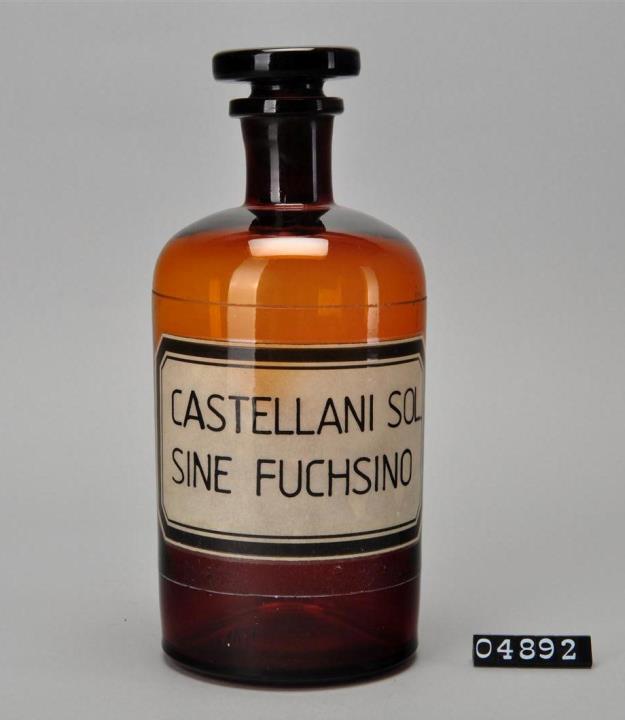 Braune, runde Flasche, aus Glas, mit eingeschliffenem Stopfen. Boden leicht aufgewölbt, flache Schulter. Signiert mit Schablonenschrift: Castellani sol. sine Fuchsino. Schild mit Klarsichtfolie überzogen.