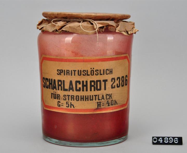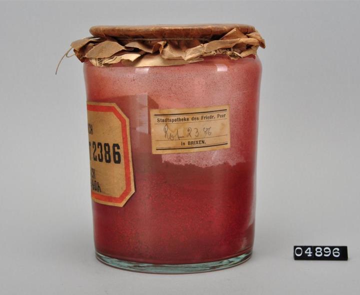 Farbloses Bindeglas, verschlossen mit Tektur aus braunem Papier. Mundgeblasen, mit großem Hefteisenabriss (ca 60mm). Signiert. Seitlich Etikett der Stadtapotheke des Friedr. Peer in Brixen: "Rot 2386". Ca. zu einem Drittel gefüllt.