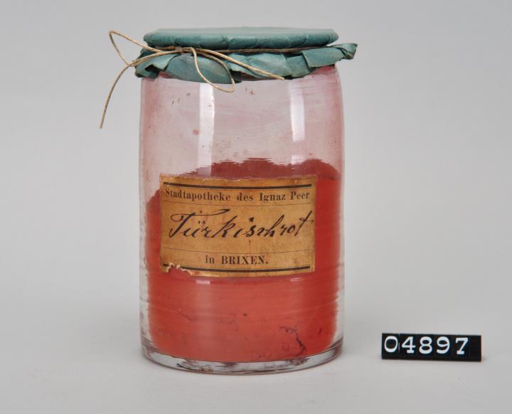 Farbloses Bindeglas, verschlossen mit Tektur aus blauem Papier. Mundgeblasen mit Hefteisenabriss.Leicht hochgestochener Boden Signiert mit Etikett der Stadtapotheke des Ignaz Peer in Brixen: "Türkischrot". Ca. zu zwei Drittel gefüllt.