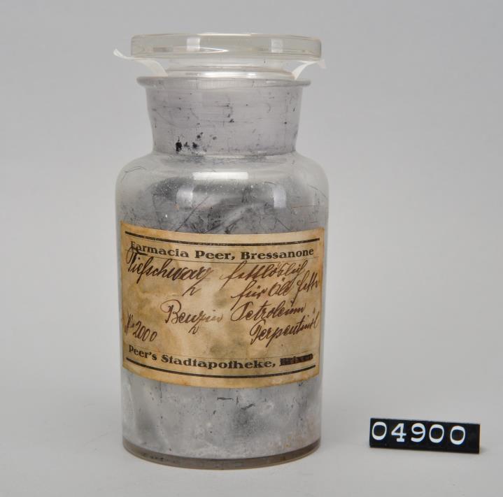 Farbloses Weithalsglas mit Schliffstopfen, gepresst. Mit Bodenprägung "175". Signiert, mit Etikett der Farmacia Peer, Bressanone: "Tiefschwarz". Fast voll.