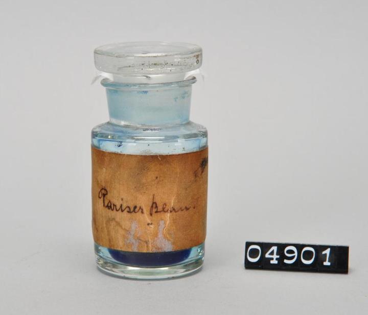 Farbloses Weithalsglas mit Schliffstopfen. Mundgeblasen, leicht nach unten konisch zulaufend, Boden geschliffen und leicht eingewölbt. Signiert: "Pariser blau". Mit Inhalt