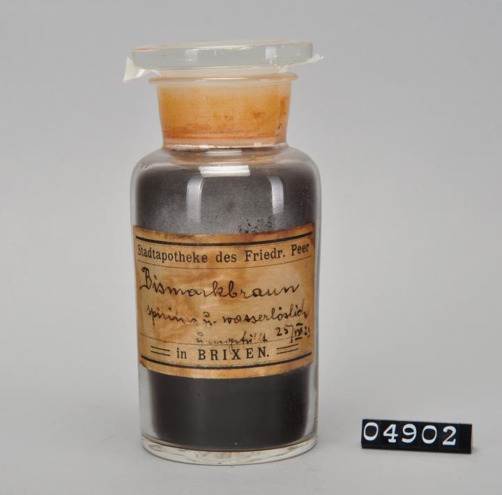 Farbloses zylinderförmiges Weithalsglas mit flacher Schulter. Schliffstopfen. Gepresst, Boden leicht eingewölbt. Signiert: "Bismarkbraun". Umgefüllt am 25.8.1923. Mit Inhalt.