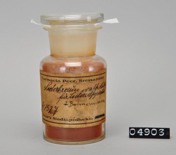 Farbloses Weithalsglas mit Schliffstopfen. Gepresst, Boden leicht eingewölbt. Etikette der Farmacia Peer, Bressanone. Signiert: "Lederbraun N. 1527". Zur Hälfte gefüllt.