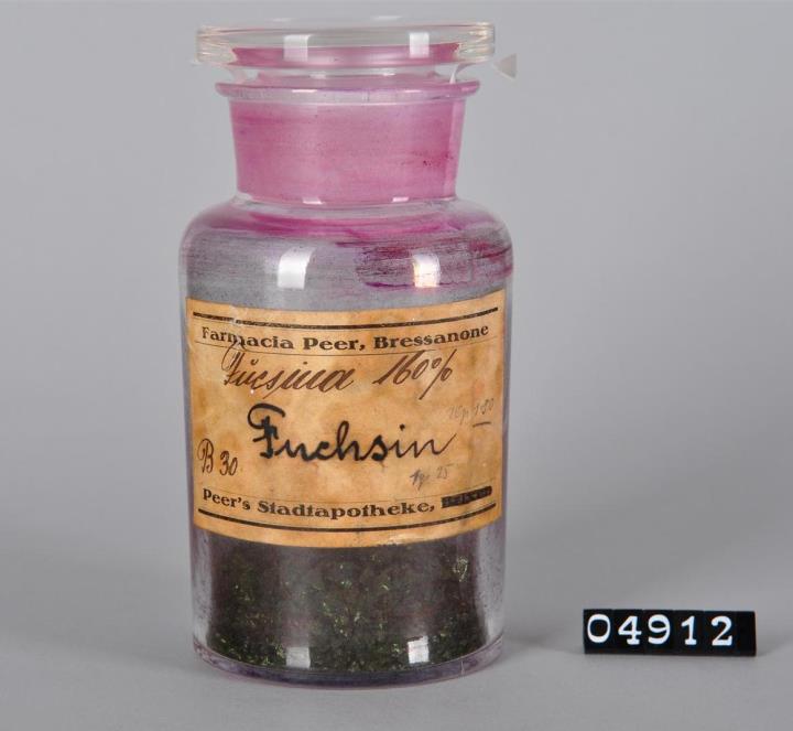 Farbloses Weithalsglas mit Schliffstopfen. Flache Schulter. Gepresst, Boden leicht eingewölbt mit geprägter Größenangabe. Signiert. Etikett der Farmacia Peer, Bressanone - Peer's Stadtapotheke, (Brixen durchgestrichen). Mit Inhalt, ca zwei cm.