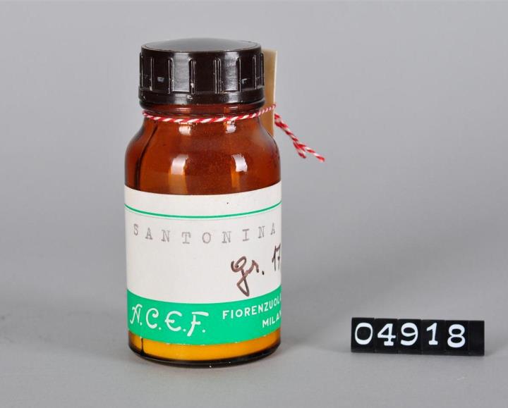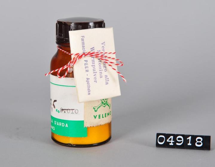 Braune Weithalsflasche aus Glas, brauner Bakelitschraubverschluss. Bodenprägung: 50. Mit Pulverbriefchen: Vermifugo alla Santonina - Wurmpulver, Farmacia Peer Apotheke. Signiert. Handschriftliche Ergänzung von Toni Kerer: gr. 17,5. Mit Inhalt.