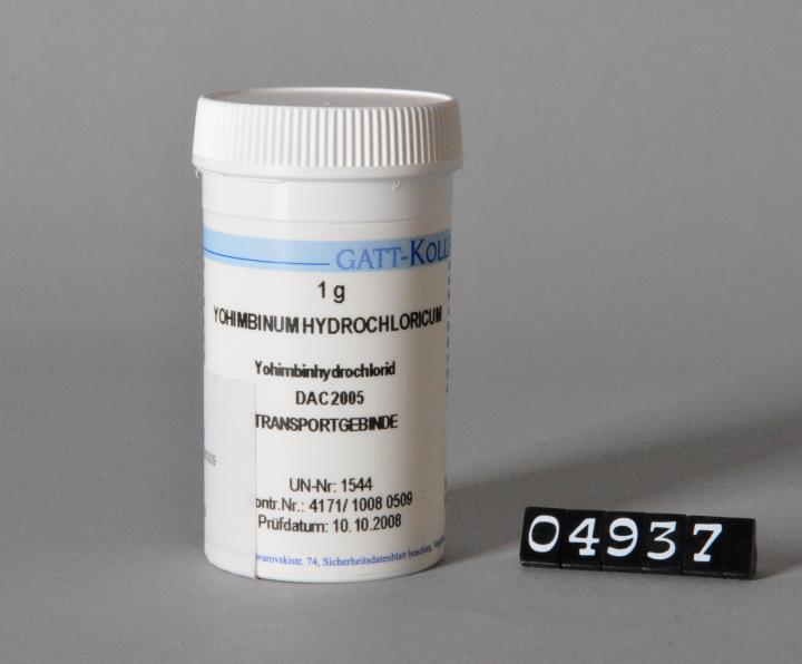 "Securibox" = Behälter mit Aufprellverschluss-System der Firma Joma Austria. Weiße Dose aus Polypropylen (PP) mit weißem Deckel aus niederdichtem Polyethylen (LDPE). Etikett der Firma Gatt-Koller. Mit Chargenschild der Stadtapotheke Peer vom 04/02/2009. Inhalt teilweise entnommen.