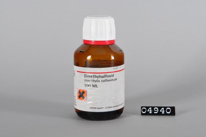 Braune Glasflasche mit weißem Schraubdeckel und rotem Sicherungsring. Signiert. Etikett der Fagron GmbH, Barsbüttel. Abgefüllt am 27.07.2008. Chargenschild der Stadtapotheke vom 29/01/2010. Zur Hälfte mit Dimethylsuloxid gefüllt.