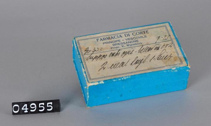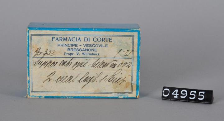 Schiebeschachtel mit blauem Glanzpapier überzogen. Einfarbig bedrucktes Firmenetikett der Hofapotheke Brixen. Mit Rezepturbuchnummer (Rp. 333) und Preis (7.25 Lire) Ohne Inhalt.