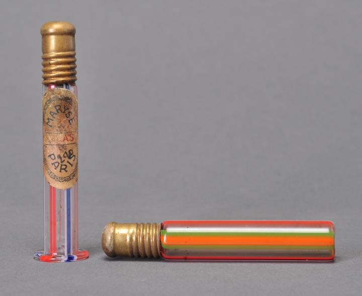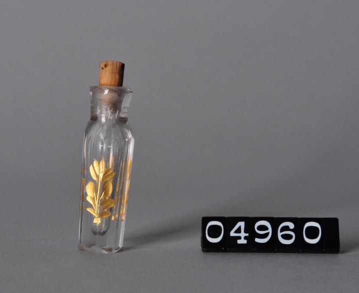 Achteckiger, leicht konisch geschliffener Kristallglasflakon mit geätztem Goldblattdekor an zwei Seiten. Boden leicht schräg geschliffen. Mit Kork verschlossen. Eingeschliffener Glasstöpsel fehlt. Wahrscheinlich Parfümflakon. Sowie zwei runde Flakons mit Metall-Drehverschluß aus Messing der Firma Maryse, Paris mit geraden, farbigen Bändern. Davon ein Flakon mit Standfuß und Etikette.