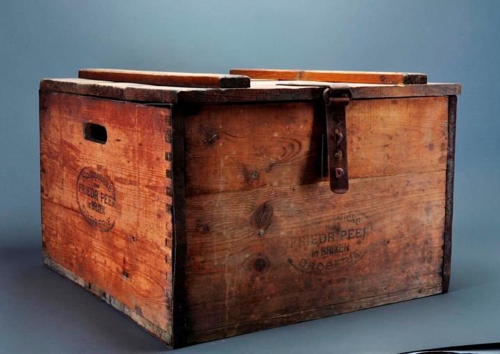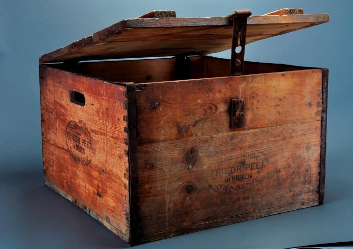 Transportkiste aus Holz für 25 Siphonflaschen mit Scharnierdeckel und mit einem Vorhängschloss versperrbar. Seitlich zwei Einsparungen zum Tragen der Kiste. Innen Querteiler aus Holz für die Flaschen. Eingebranntes Logo in ovaler Kartusche der Stadtapotheke des Friedrich Peer in Brixen Drogerie an allen vier Seiten und am Deckel. Deckel außen mit zwei Holzleisten verstärkt. Boden genagelt, Seitenteile gezinkt und mit einem im Holz eingefräßten Eisenband verstärkt. Am Boden ist das Eisenband teilweise durchgerostet. Teilweise mit Holzwurmlöchern.